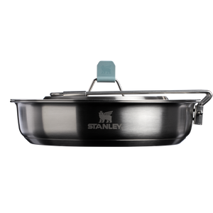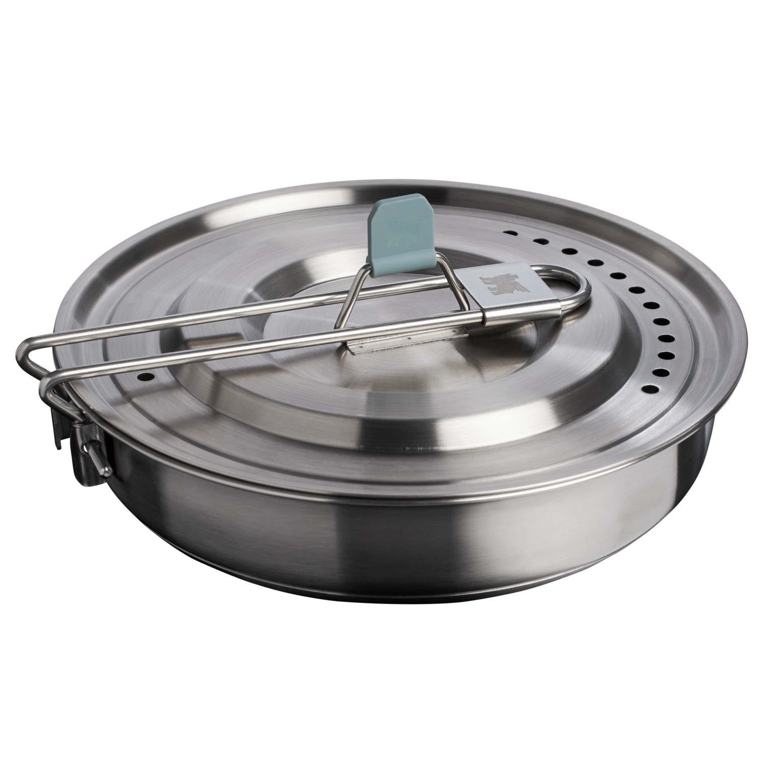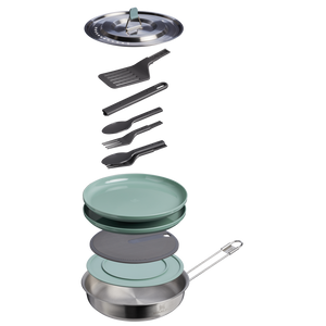 Simple and efficient, the 12-piece Wildfare Core Fry Pan Cookset nests together for packing ease. The tri-ply bonded stainless steel pan evenly distributes heat, and the lid has vent and strain holes. The 2-piece spatula and 2-spork set go from compact to full sized. A nonslip cutting board offers space to prep meat and vegetables, while a removable silicone trivet protects surfaces from hot pans. Colorful plates complete the set for outdoor hosting with the comfort of home.